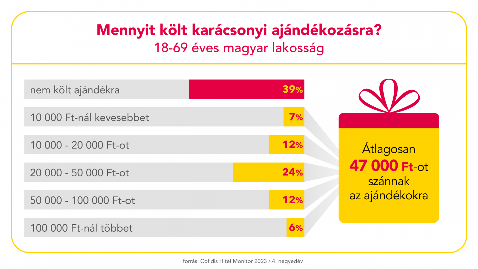 Az ünnepi büdzsét átlagosan 118 000 forintra tervezik a magyarok idén, ebből szeretnék kigazdálkodni az ajándékokat és a menü hozzávalóit is - derül ki a Magyar Marketing Szövetség vállalati tagja, a Cofidis Hitel Monitor kutatásából. Ez közel 20 százalékkal több, mint a tavalyi. A többség (61%) tervez ajándékot vásárolni is, átlagosan 47 000 forintot költene ajándékokra ebben a szezonban. Tavaly karácsonyhoz képest 56-ról 65 százalékra nőtt azok aránya, akik az aktuális havi jövedelmükből tervezik fedezni ezt a kiadást, 40 százalék megtakarításból, 7 százalék pedig hitelből is finanszírozza a szükséges összeget.