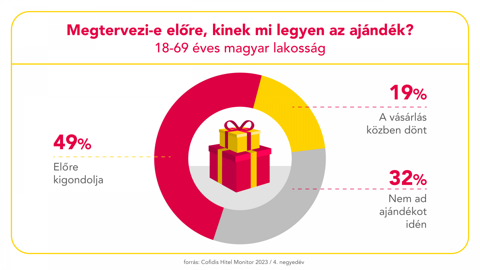 Az üzletekben való nézelődés befolyásolja a választást, de csak a lakosság egyötöde az, aki a karácsonyi bevásárlótúra közben dönti el, mi legyen a fa alatt. A magyarok fele nem bízza a véletlenre, előre kigondolja, kinek mit szeretne venni. Nem meglepő, hogy az ajándékot adók legnagyobb része novemberben rohamozza meg a boltokat, ám a Cofidis Hitel Monitor kutatásból kiderül, hogy 17 százalékuk már októberben vagy azt megelőzően elkezdte a vásárlást. A toplistát továbbra is a kozmetikum (31%), a ruhanemű (29%) és a márkás italok, élelmiszerek (28%) vezetik. Ismét egyre népszerűbbek a konyhai kisgépek, 13 százalék ebben a kategóriában gondolkodik.