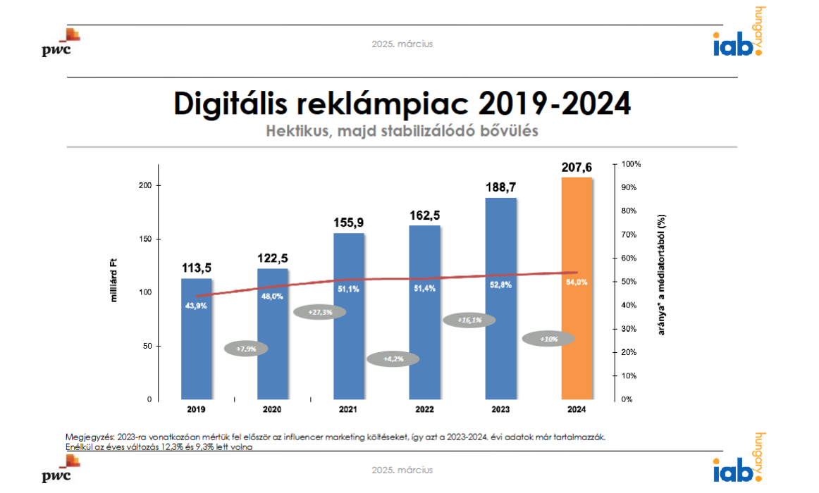 A jelentés alapján 2024-ben 207,625 milliárd forint volt a digitális reklámköltés Magyarországon, ami 10 százalékos növekedést jelent az előző évhez képest. A piac tehát 2019 óta folyamatosan növekszik. Az éves bontást mutató grafikonon 2022-ről 2023-ra egy jelentősebb ugrás látható, aminek az az oka, hogy ekkor kerültek be az influencer kategória számai.