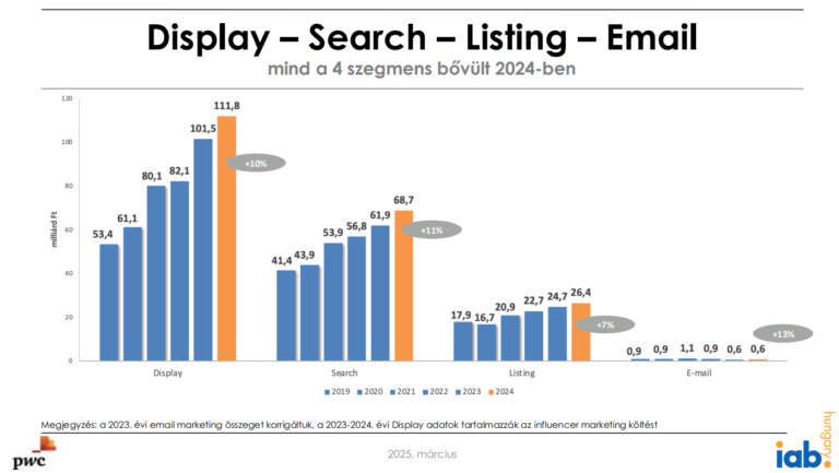 Novák kiemelte, hogy a display 2019 óta több mint duplájára nőtt, de érdemes figyelembe venni, hogy ebbe a paid social media hirdetései is beletartoznak. A search ugyan kisebb mértékben nőtt, mint a teljes digitális költés, de a bővülése folyamatos. Ugyanez igaz a listingre is, ugyanakkor ez volt az egyetlen szegmens, amelyik nagyon megsínylette a 2020-as évet, és az utóbbi években csak egyszámjegyű növekedést tudott produkálni. A jelentésből kiderül, hogy a listing hat nagyon eltérő habitusú, működésű részterületből áll, amelyek közül például az álláspiac 2024-ben csökkent, míg az autó és ingatlanpiac radikálisan nőtt. Az email marketing területén pedig 2023-ban kisebb korrekciót kellett tenni, amihez képest történt némi növekedés, de ez messze van a 3-4 évvel ezelőtti dinamikától.