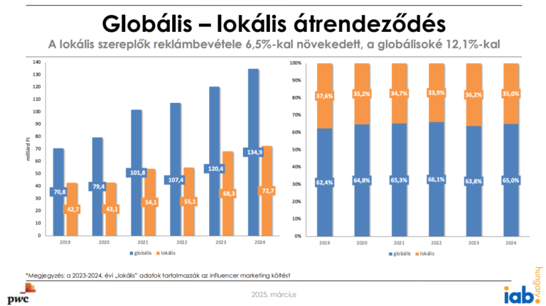 A globális és lokális szereplők közötti bevételmegoszlás továbbra is kétharmad/egyharmad, de miközben a hazaiak bevétele 6,5%-kal nőtt tavaly, addig a globálisoké 12,1%-kal. Külön vizsgálták a magyar tartalomszolgáltatók bevételeit, akik mintegy 44 milliárd forintot realizálhattak 2024-ben a digitális hirdetésekből.