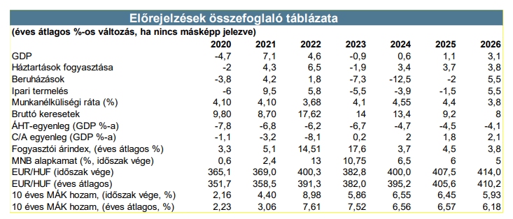 Az eszkalálódó vámháború hazai inflációra gyakorolt tényleges hatása több ellentétes irányú folyamat eredője, összességében azonban rövid távon a dezinflációs tényezők lehetnek túlsúlyban. A gyengébb kereslet dezinflációs hatású lehet, ugyanígy árleszorító hatással járhat, ha az USA piacáról kiszoruló export egy része esetleg Európába irányul át. Az EU potenciális válaszlépései ellenben emelhetik az inflációs rátát. A forint gyenge/gyengülő árfolyama felfele mutató kockázatot, a globális lassulás miatt az energiahordozók potenciálisan alacsonyabb világpiaci ára lefele mutató kockázatot jelent. Az inflációs cél elérése időben kitolódott, számításaink szerint legkorábban 2026ban süllyedhet újra az infláció a jegybank 2-4 százalék közötti toleranciatartományába.