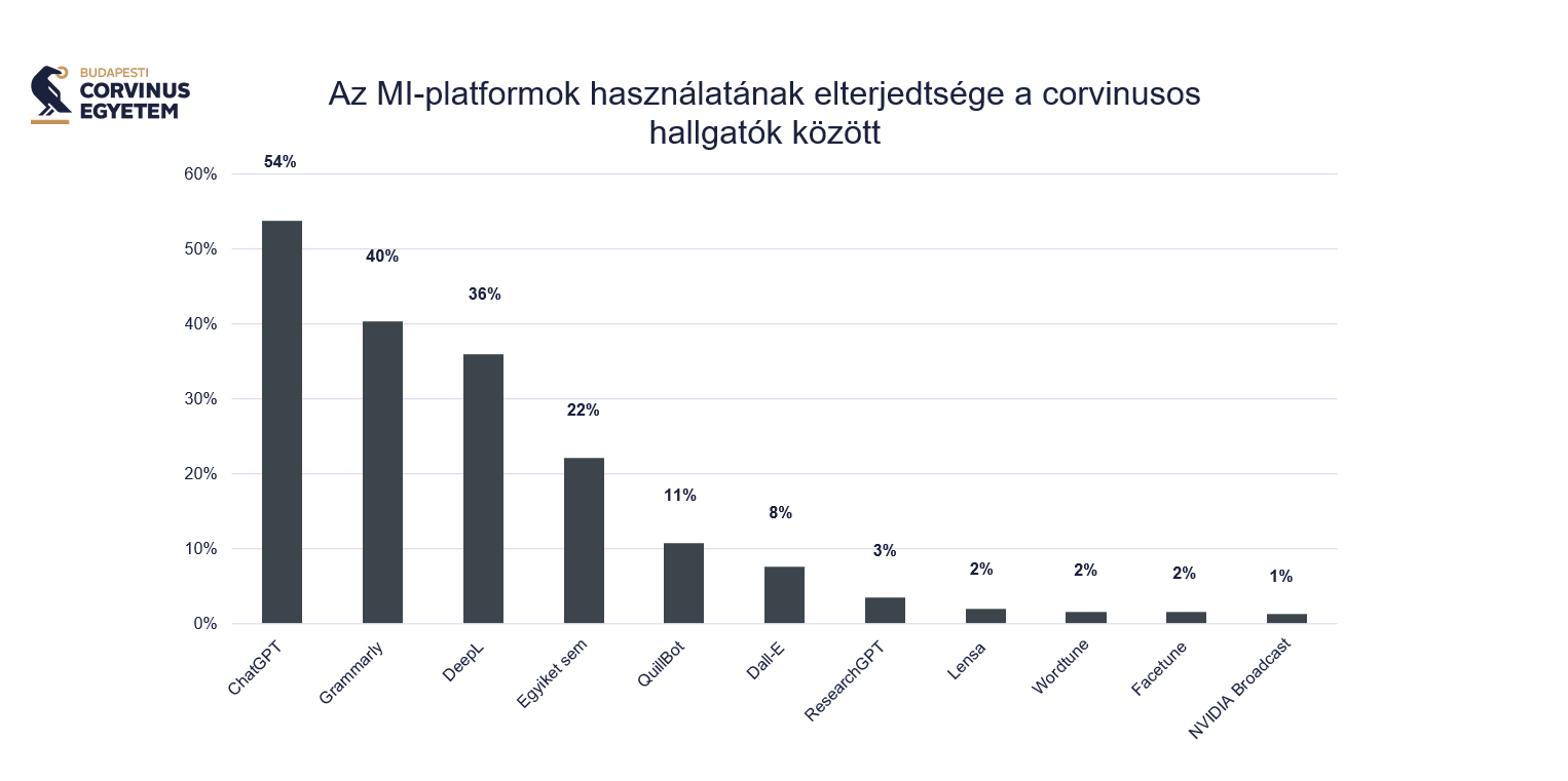A felmérésben részt vevő hallgatók 91 százaléka ismeri, több mint fele (54 százaléka) használja is tanulmányaihoz a ChatGPT-t, amely a legnépszerűbb MI-platform jelenleg a résztvevők körében. Az ezüstérmes helyet a Grammarly angol nyelvhelyesség-ellenőrző szolgáltatás (77 százalékos ismertség, 40 százalékos használat), a bronzérmet a DeepL nyelvi fordító (47 százalékos ismertség, 36 százalékos használat) szerezte meg. Szövegalkotásnál sokan alkalmazzák még angol nyelven egy-egy gondolatmenet tömör összefoglalásához a Quillbot nevű szolgáltatást is (22 százalékos ismertség, 11 százalékos használat). A válaszadók 22 százaléka azonban, bár ismeri ezeket a technológiákat, bevallása szerint nem használja egyik platformot sem tanulmányaihoz.
