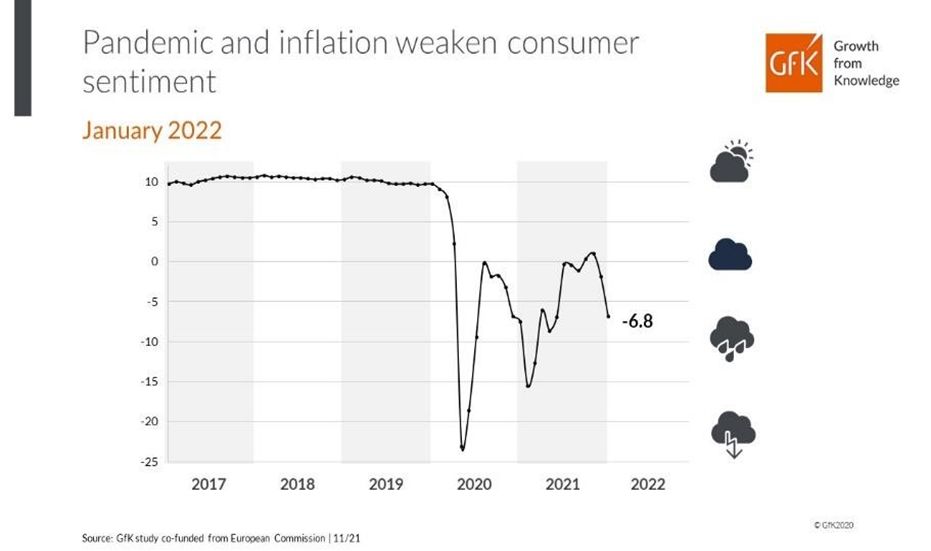 "A fogyasztói bizalom az év végéhez közeledve két ok miatt is nagy nyomás alatt van. Az egyik a koronavírus-járvány negyedik hulláma miatti magas esetszámok és további korlátozások, a másik ok a jelentősen megemelkedett árak egyre nagy nyomást gyakorolnak a fogyasztói hangulatra. Az omikron variáns gyors terjedése miatt a jövő év elejére vonatkozó kilátások is visszafogottak".