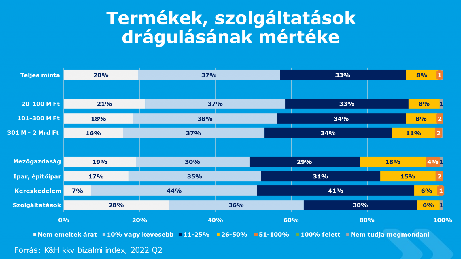 Az emelkedő költségek hatására ötből négy cég volt kénytelen árat emelni a felmérést megelőző fél évben. 37 százalékuk maximum 10 százalékkal, minden harmadik cég 11-25 százalék között, közel minden tizedik cég (9%) pedig 25 százalékot meghaladó mértékben.