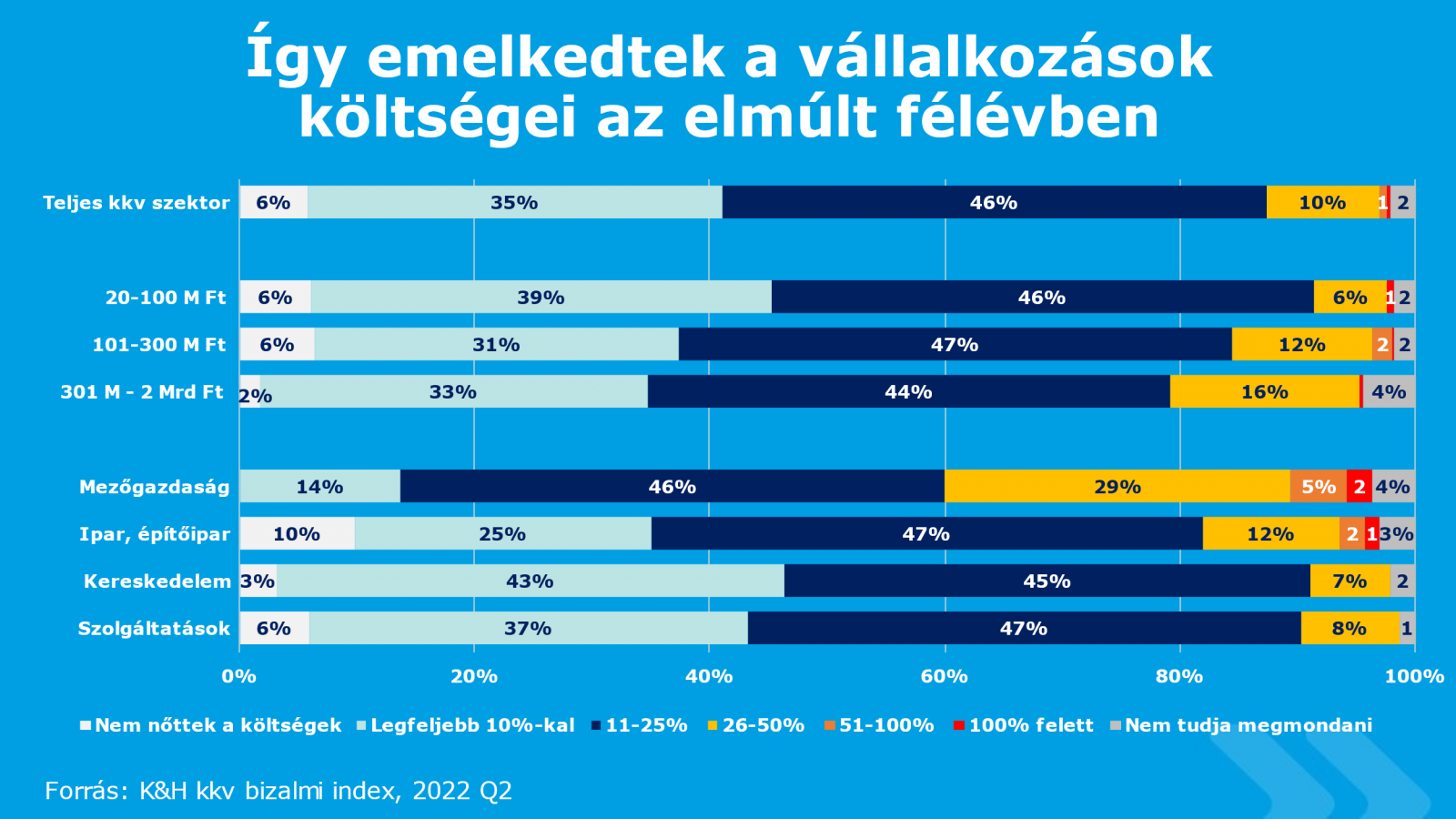 „Az orosz-ukrán katonai konfliktus elhúzódása a hazai vállalkozások egyéves várakozásaira is hatással van. Az árfolyamváltozás, az áremelkedés és az anyagbeszerzési nehézségek ugyanis mind a vállalati költségek emelkedésével járnak, ami meghatározó a további pénzügyi és beruházási terveket illetően. A kutatásból az is látható, hogy ez a hatás az egyes szektorokban eltérő mértékben jelentkezik. A mezőgazdasági cégek 66 százaléka, a kereskedelmi és a szolgáltató cégek nagyjából harmada (35%), az ipari, építőipari vállalkozásoknak pedig 45 százaléka jelezte azt, hogy nagymértékben befolyásolja 12 hónapra vonatkozó terveiket a katonai konfliktus” – mutatta be az eredményeket Rammacher Zoltán, a K&H kkv marketing és értékesítés támogatás vezetője.