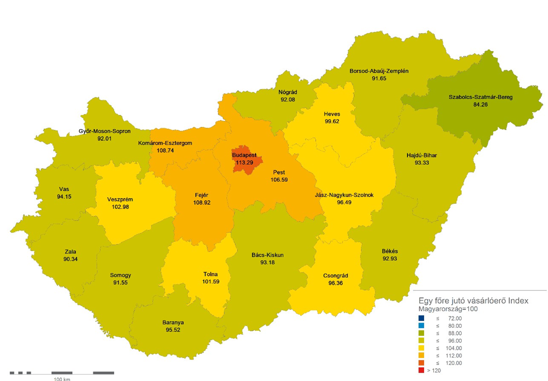 Ahogy a térképen is látszódik, kirajzolódnak bizonyos regionális különbségek, amelyek viszont nem olyan nagy mértékűek, mint amikor a teljes elkölthető jövedelmet vizsgáljuk. Minél kisebb földrajzi egységet veszünk, a jellemzők annál pontosabban vizsgálhatók.