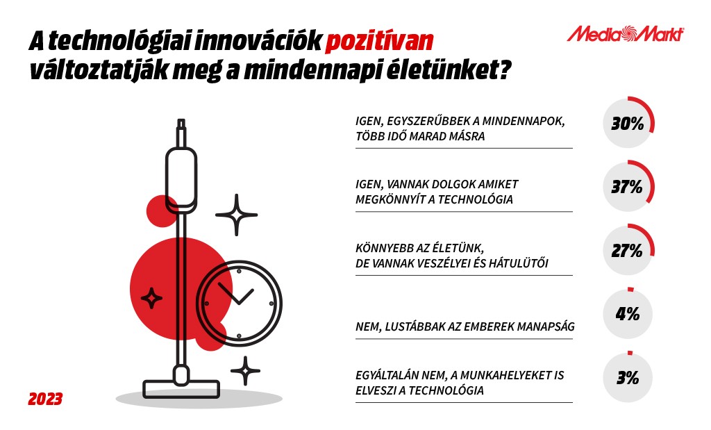 Bár sokszor adunk hangot a technikával és még inkább a mesterséges intelligencia fejlődésével, felhasználásával kapcsolatos félelmeinknek, úgy tűnik, hogy ezek a félelmek valójában egyelőre inkább csak elmélkedések, hiszen a kutatásban résztvevők mindössze hét százaléka gondolja úgy, hogy a technológiai újdonságok inkább károsak, míg több mint kétharmaduk teljes mértékben, vagy inkább támogatja az újításokat. A legtöbb válaszadó szerint a technológia megkönnyíti (64%) a mindennapokat és sokak szerint több szabadidőt biztosít (39%), ugyanakkor ezt mások úgy értékelték, hogy ezek az eszközök túlságosan is elkényelmesítenek (57%).