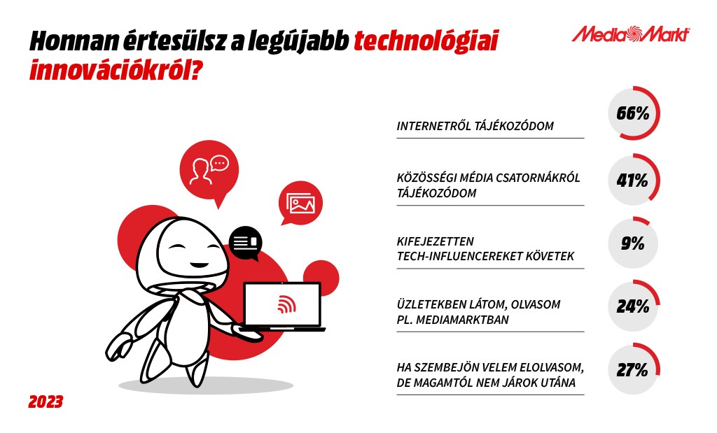 A legtöbben az internetről, hírportálokról, tematikus oldalakról tájékozódnak a technológiai hírekről. A férfiakra (72%) még inkább jellemző a weboldalak, összehasonlító oldalak böngészése, mint a nőkre (59%), akik ezzel szemben szívesen fordulnak tanácsért a szakképzett eladókhoz az áruházakban. Összességében a tájékozódási pontok tekintetében a közösségi médiafelületek a második helyen végeztek, de itt fontos eltérés van már a korosztályok közt: a fiatalok közt egyértelműen a social média a legfrekventáltabb forrás, míg az idősek közt ez kifejezetten hátra szorult a listán.