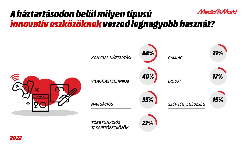 Az innovatív eszközök használata kifejezetten jellemző az otthonokban, elsősorban a konyhai- ésháztartási gépek (64%) vonatkozásában veszik a legtöbben hasznát a technológiai újításoknak. A felhasználási területek között szinte minden kategóriában jelentős eltérés van a nemek között: a világítástechnikában a navigációban és a gaming területén a férfiak, a szépség-egészség, konyhai gépek vonalon a nők használnak több innovatív technológiát.