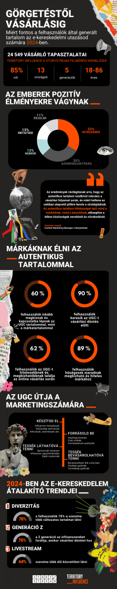 A TERRITORY Influence ügynökség 18 és 86 évesek körében végzett kutatás megmutatta, hogy az influencerek tartalmai (UGC) jelentősen befolyásolják a vásárlási szokásokat, nagyobb elkötelezettséget generálva. A kutatásban 24 549-en vettek részt 13 különböző országból, beleértve Magyarországot is. A kitöltők 49%-a nyilatkozott úgy, hogy vásárolt az ilyen típusú tartalom megtekintése után. A barátok ajánlásai (WOM) továbbra is fontosak, ahol akár 75% dönt a vásárlás mellett, pozitív felhasználói vélemények alapján.