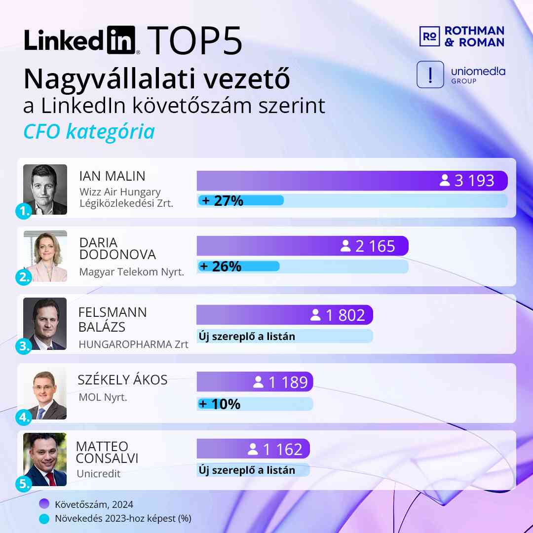 Idén immár másodízben vizsgálta az Uniomedia kutatása a pénzügyi vezetők LinkedIn-aktivitását és eredményességét. Követőszám szerint az első helyen Ian Malin, a Wizz Air CFO-ja, a másodikon pedig Daria Dodonova, a Telekom pénzügyi vezérhelyettese végzett – utóbbi a tavalyi negyedik helyről lépett kettőt előre. Új szereplő a listán Felsmann Balázs (Hungaropharma) és Matteo Consalvi (Unicredit), de bekerült a top 5-be Székely Ákos (MOL) is. Az engagementeket nézve Daria Dodonova (Telekom), Matteo Consalvi (Unicredit), Felsmann Balázs (Hungaropharma), Achim Grewe (Audi Hungária) és Silke Janz (Penny) a sorrend a pénzügyesek között.
