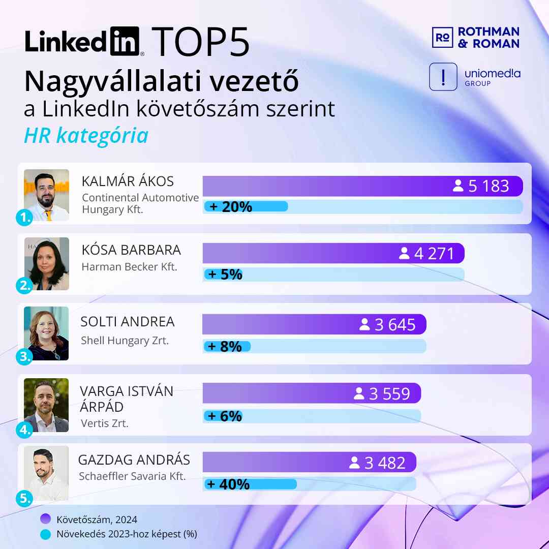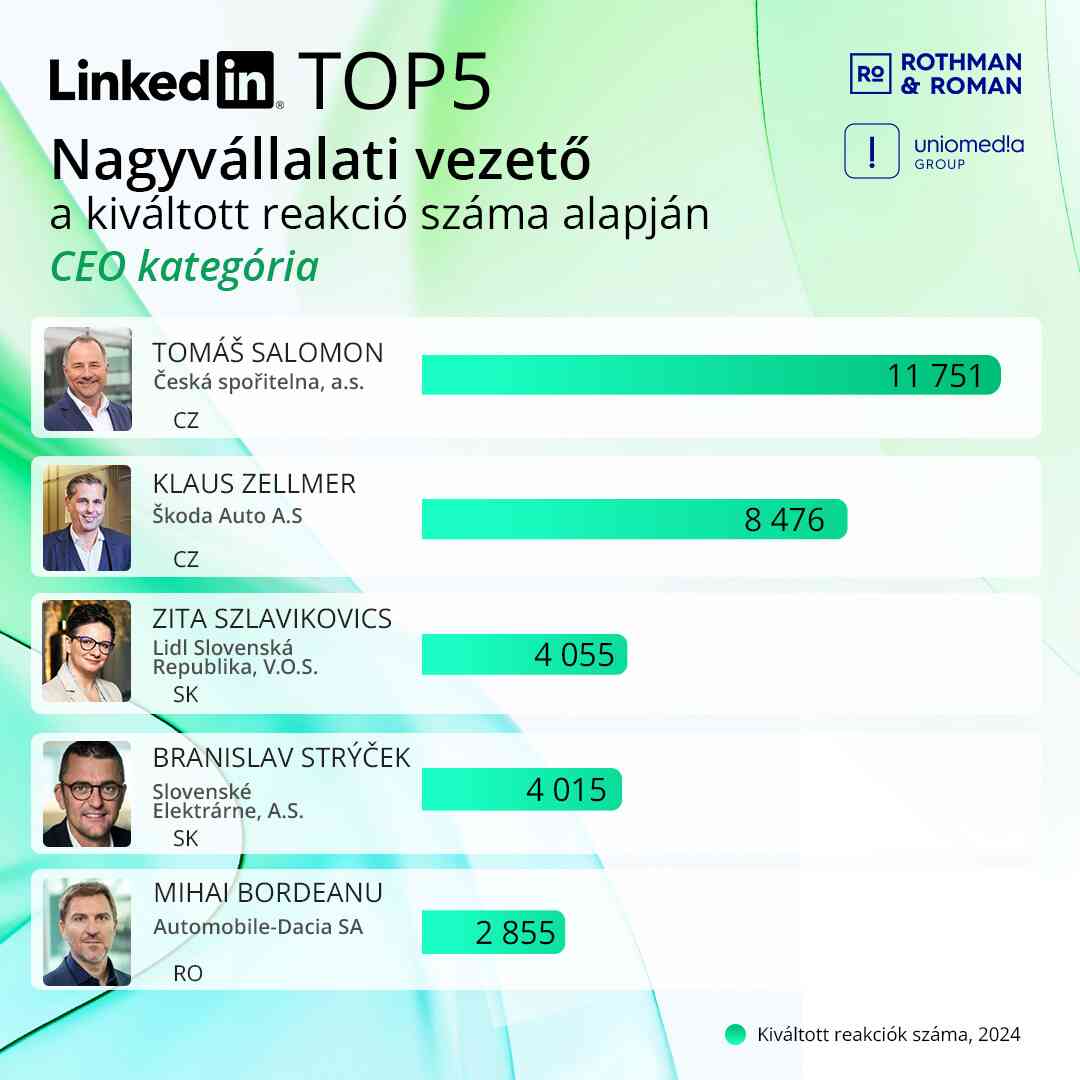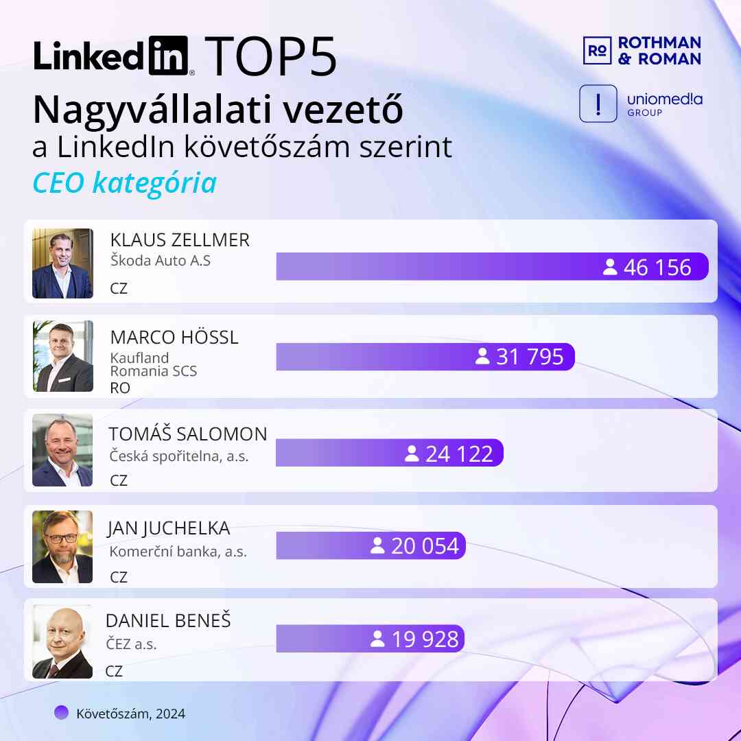 2024-ben első ízben állított össze regionális nagyvállalati toplistát a Rothman&Roman (Uniomedia anyavállalata) azt követően, hogy az elmúlt három évben az Uniomedia elkészítette a legnagyobb magyar cégeknél dolgozó felsővezetők LinkedIn-profiljának elemzését. A kelet-közép-európai nagyvállalat-vezetők helyi elemzésében az Uniomedia mellett a cseh KNKTR is részt vett, hogy kiderüljön, melyik országban milyen aktívan használják a szakmai platformot üzleti- és kommunikációs célra a gazdaság legfontosabb szereplői. Az adatok egyértelműen a LinkedIn vezetői kommunikációban, vállalati és munkáltatói márkaépítésben, illetve a belső kommunikációban betöltött szerepének erőteljes felértékelődését jelzik.
