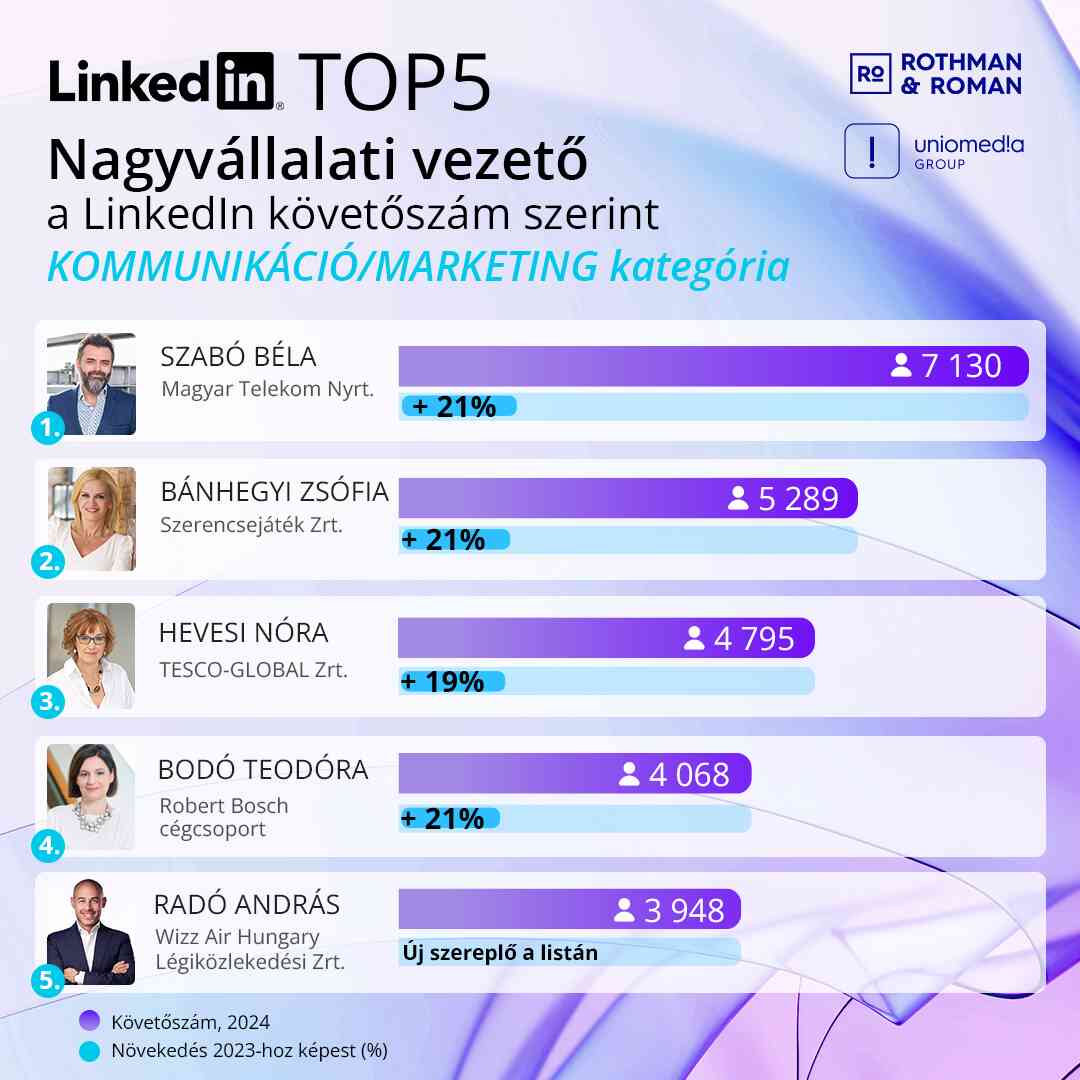 A marketing- és kommunikációs vezetők sorrendje egyetlen lényegi ponton módosult: Radó András, a Wizz Air kommunikációs és kormányzati kapcsolatok vezetője leszorította az ötödik helyről Kutas Istvánt, az MBH Bank kommunikációs ügyvezető igazgatóját. A követőszám szerinti listát továbbra is Szabó Béla, a Magyar Telekom márkakommunikációs igazgatója vezeti – 2024-ben 21 százalékkal növelve táborát –, ahogy eddig minden évben. Őt Bánhegyi Zsófia, a Szerencsejáték Zrt. kereskedelmi vezérigazgató-helyettese, Hevesi Nóra, a Tesco kommunikációs igazgatója, és Bodó Teodóra, a Robert Bosch cégcsoport kommunikációs igazgatója követi.