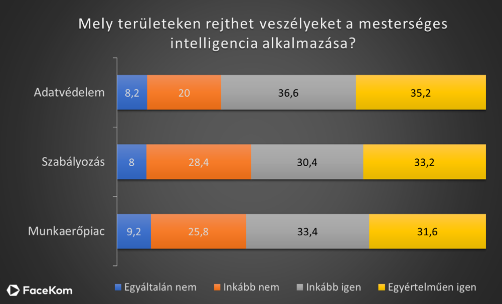 A kutatás eredményei alapján az is kiderült, hogy a fejlődő mesterséges intelligenciától több területen is tartanak a megkérdezettek. A legtöbben (72%) egyetértettek azzal, hogy a mesterséges intelligencia felhasználhatja a személyes adatokat, ami aggodalmakat vet fel az adatvédelem és a magánélet védelme terén. A válaszadók 65 százaléka azzal is egyetértett, hogy a mesterséges intelligencia kiválthat bizonyos munkaköröket, így emberek veszíthetik el miatta az állásukat. A megkérdezettek 64 százaléka szerint a szabályozás területén is veszélyeket rejt az új technológia, hiszen nem egyértelmű, ki viseli a felelősséget a mesterséges intelligencia döntéseiért, ami jogi aggályokat vet fel.