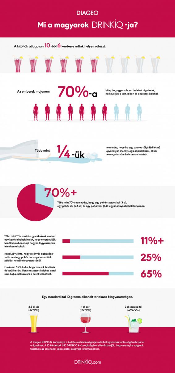 Az elmúlt időszakban hazánkban 7.200 ember tesztelte a DRINKiQ kvíz segítségével, hogy mennyit is tud az alkoholról. Az eredményekből azt láthatjuk, hogy a tavalyi évhez hasonlóan, a kitöltők átlagosan 10-ből 6 kérdésre adtak helyes választ. A kérdéseknek köszönhetően kideríthetjük, hogy mennyit tudunk az alkoholról, illetve annak szervezetünkre gyakorolt hatásairól.