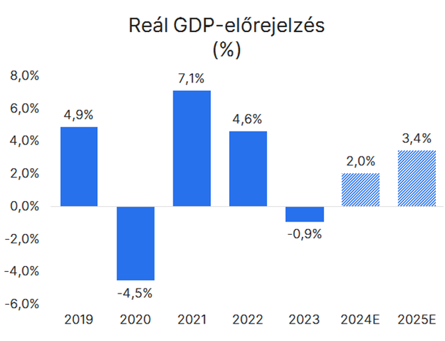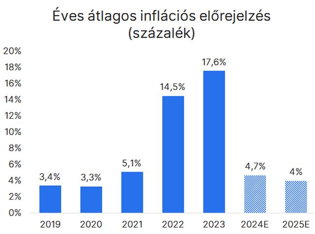 Az infláció januárban visszatért a jegybanki toleranciasávba, ugyanakkor nem marad ott sokáig, az első hónapban mért 3,8 százalékos pénzromlás valószínűleg az egyik legalacsonyabb volt idén. Az Erste elemzői 2024-ben 4,7 százalékos, míg 2025-ben 4 százalékos inflációval számolnak, szemben a 2023-ban mért 17,6 százalékkal. A hazai inflációs környezet így már lényegesen jobb lesz nemzetközi összehasonlításban, mint korábban, ugyanakkor nem kizárt, hogy továbbra is az unió legmagasabb árdinamikával működő országai közé fogunk tartozni.