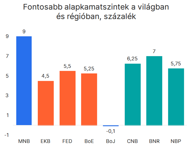 A pénzromlás ütemének csökkenésével párhuzamosan a jegybanki alapkamat is folyamatosan ereszkedik, tavaly május óta a Magyar Nemzeti Bank lényegében megfelezte az irányadó kamatszintet. A jelenleg 9 százalékos alapkamat már közelít a régiós versenytársakhoz, ám a koronavírus-járvány előtti időszakhoz képest megváltozott környezetben egyelőre kérdéses, hogy hol húzódhat egy tartósabb, egyensúlyi kamatfelár. A második negyedévtől a dezinfláció kifulladása, valamint a világ vezető jegybankjainak a korábban gondoltnál tartósabb szigora ismét lassíthat a kamatcsökkentési ütemen. A félév végére a jegybanki alapkamat 6,5 százalék lehet.