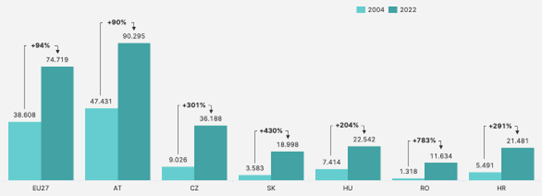 „2024-ben ünnepeljük az Európai Unió kelet-közép-európai bővítésének huszadik évfordulóját, amelynek során Csehország, Magyarország és Szlovákia is szerepet kapott az EU eddigi legnagyobb, tíz új belépőt jelentő csatlakozási hullámában. Az elmúlt húsz év során a kelet-közép-európai gazdaságok jelentős fejlődésen mentek keresztül. A felzárkózási folyamat eredményként a régió egyes országai – például Csehország – nemcsak hogy sikerrel zárkóztak fel, hanem (a vásárlóérték-paritással korrigált) az egy főre eső GDP-t tekintve le is hagytak egyes nyugat-európai országokat, például Spanyolországot. A kelet-közép-európai gazdaságok hosszú távú növekedésének köszönhetően a régió lakossága és háztartásai a két évtizeddel ezelőtti szintet jelentősen meghaladó jólétet élvezhetnek” – mondta Willi Cernko.