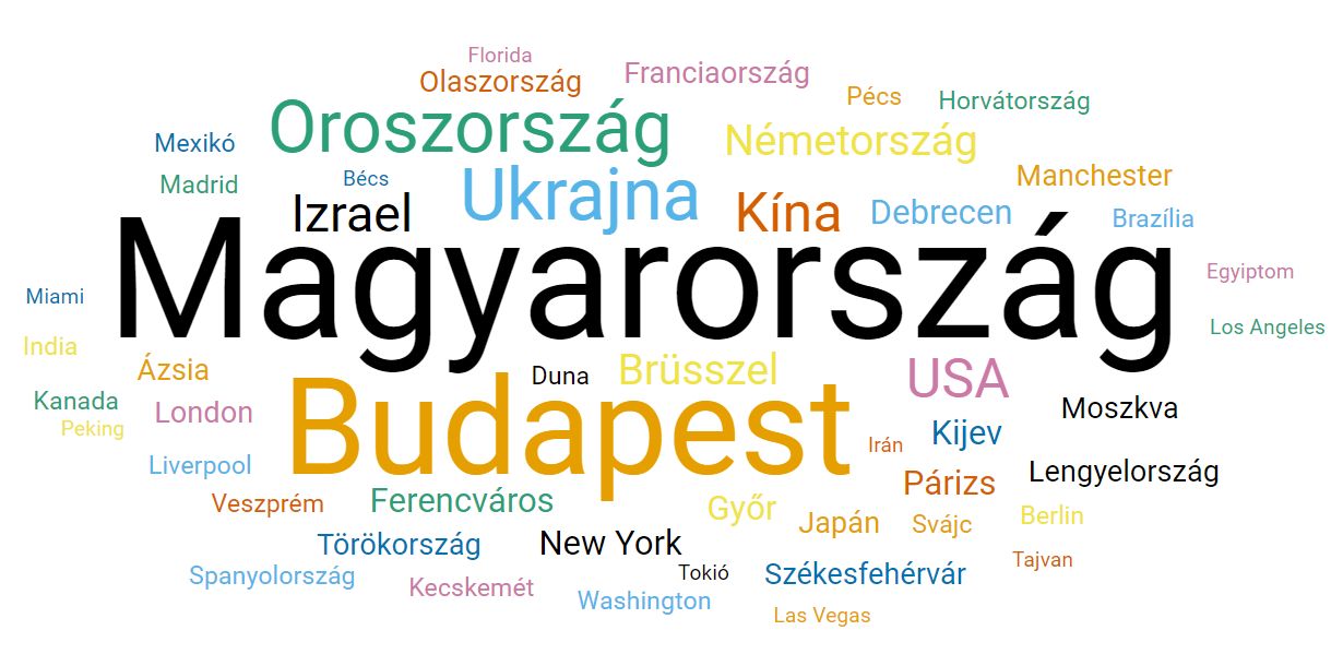 Az online médiatérben megjelent földrajzi helynevek esetében tízből négy magyar vonatkozású volt. Négy esetben az említés európai országgal vagy várossal, míg a fennmaradó részben a világ többi tájával volt kapcsolatos.