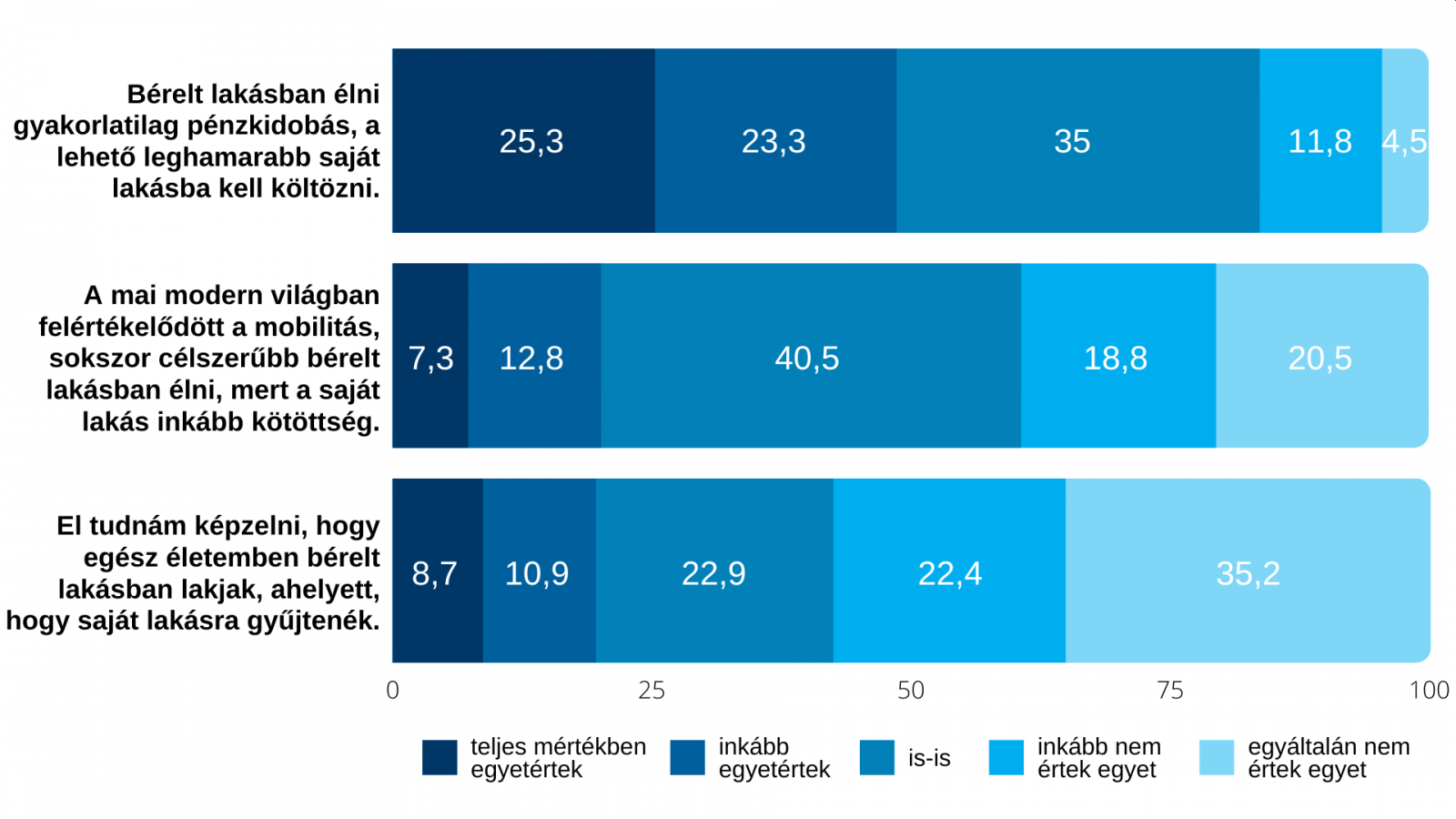 Egy évvel korábban még többségben volt ez az álláspont, akkor 54 százalékuk mondta ezt, két évvel korábban – 2020 harmadik negyedévében – pedig kétharmados többségben voltak, 67 százalékuk tartotta “pocsékolásnak” a lakásbérlést. Ezzel a jelentős, fordulatnak mondható változással összhangban van a lakásbérléssel összefüggő több vélemény is. A megkérdezett fiatalok ötöde, azaz 20 százaléka most már el tudja képzelni, hogy egész életében albérletben lakjon, szemben a korábbi három évben mért 8-17 százalékos aránnyal.