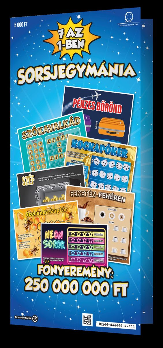 Sosem volt még olyan sorsjegy, amely minden tekintetben leg-nek számít a termék jellemzőit nézve. A Sorsjegymánia háromba hajtható formátumú, színes grafikával ellátott kaparós sorsjegy. A Magyar Marketing Szövetség vállalati tagja, a Szerencsejáték Zrt. által most kibocsátott új, prémium árkategóriás sorsjegy összesen tizenhat egyszerűbb és összetettebb játékot is tartalmaz, amelyek mindegyikét tekinthetjük a közönség kedvencének – a játékosok mini keresztrejtvénnyel, betű-, szám- és szimbólumkeresővel, kockapókerrel, illetve amőbajátékkal egyaránt próbára tehetik szerencséjüket.