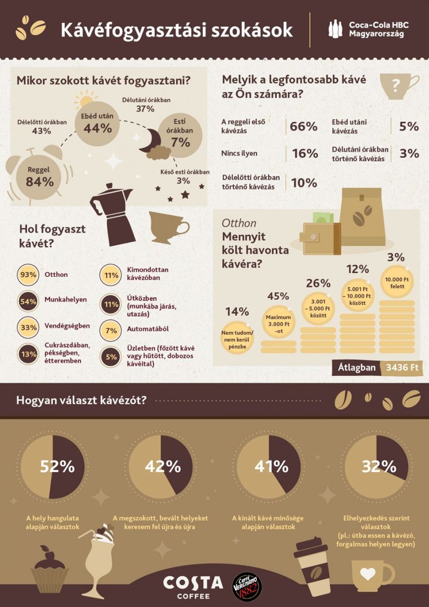 Kávézót minden második válaszadó a hely hangulata alapján választ, 40-40 százalék döntésében fontos szempont, hogy ismerje a helyet, a kínálatot, a személyzetet – illetve a választék minőségét. A válaszadók harmada az elhelyezkedés alapján dönt egy kávézó mellett.
