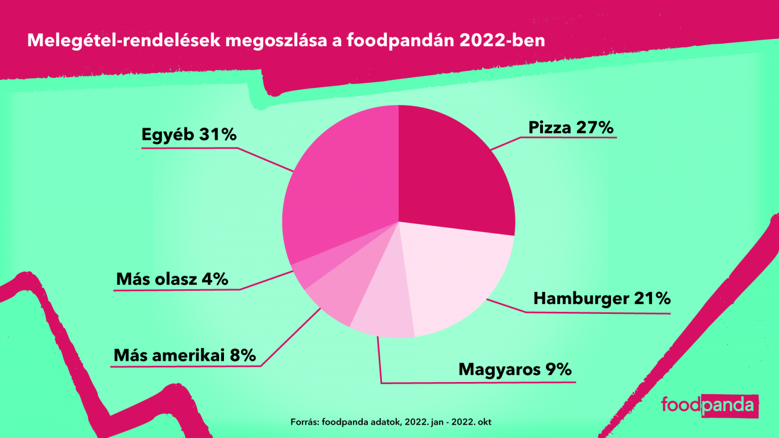Összességében fölényesen vezet a pizza és a hamburger a megkívánt melegételek között: az elmúlt egy év összes melegétel-rendeléseinek 27 százaléka volt pizza, 21 százaléka pedig hamburger. A magyaros ételek a rendelések 9, még az amerikai finomságok 8 százalékát tették ki.