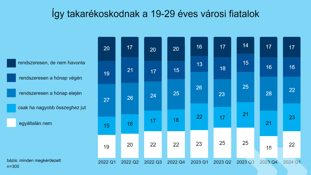 Sok fiatal igyekszik felkészülni a jövőre, azaz jelentős részük igyekszik takarékoskodni. A Magyar Marketing Szövetség vállalati tagja, a K&H ifjúsági indexe szerint az idei első negyedévben a fiataloknak már csak 22 százaléka tesz rendszeresen félre tudatosan a hónap elején – ez az elmúlt 2 év méréseinek eddigi legalacsonyabb arányszáma –, míg a hónap végén megmaradt összeget 16 százalékuk rakja el. Rendszeresen, de nem havi szinten takarékoskodik 17 százalékuk, 23 százalékuk, ami a 2022 eleje óta mért legmagasabb arány, pedig csak akkor tud spórolni, ha nagyobb összeget kap. Összesen a megkérdezettek túlnyomó része, 78 százaléka takarékoskodik valamilyen szinten. Ugyanakkor ez azt is jelenti, hogy legalább ötödük, 22 százalékuk egyáltalán nem szokott vagy valamilyen okból nem tudott félretenni mostanában.