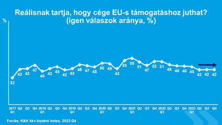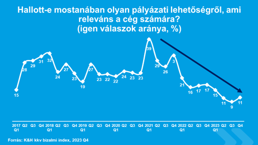 A Magyar Marketing Szövetség vállalati tagja, a K&H magyarországi mikro-, kis- és középvállalkozások következő egy évi várakozásait jelző kkv bizalmi indexének legutóbbi, 2023 negyedik negyedéves felmérése szerint a kkv-k egyelőre még bizonytalanok az uniós pályázatokkal kapcsolatban.