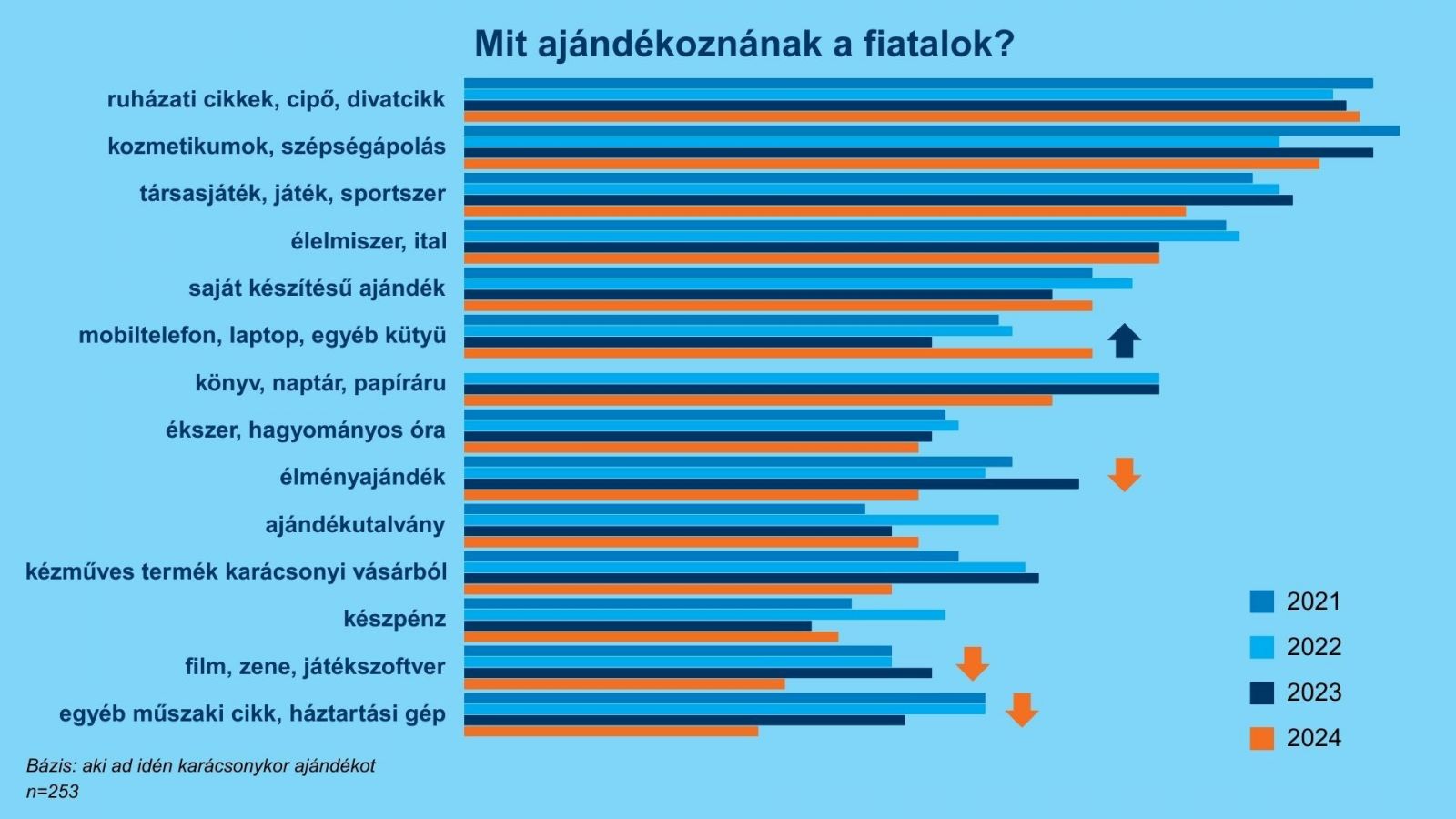 Az élelmiszert, italt az idén az ajándékozó fiatalok 52 százaléka említette, ami megfelel az egy évvel korábbi értéknek. Mobilt, laptopot vagy egyéb kütyüket a tavalyi 35 százalékhoz képest idén 47 százalék tervez adni. A könyvek 44, az ékszerek vagy órák 34 százalékkal szerepelnek az idei tervekben, csakúgy, mint az élményajándék, illetve az utalvány. A készpénzt, mint ajándékot 28% fontolgatja. Főleg a férfiak (36 százalék) és az aktív keresők (35 százalék) említették ezt.