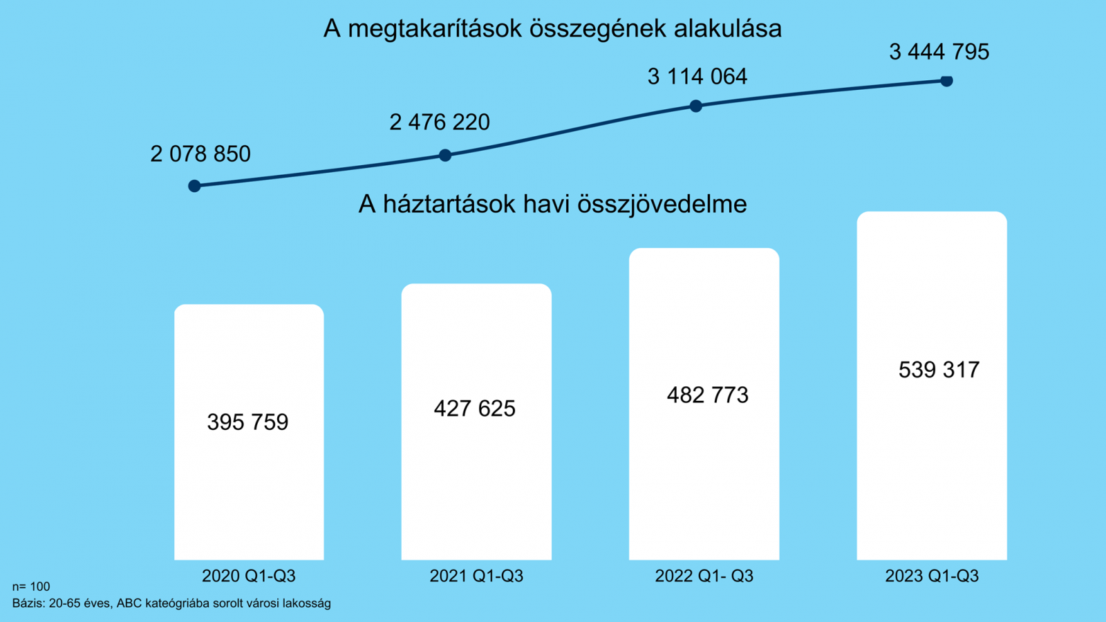 A havi kilengéseket kiegyensúlyozó negyedéves adatok szerint az idén július és szeptember vége között ezen háztartások nettó összjövedelme meghaladta az 539 ezer forintot, ami az egy évvel korábbi 503 ezer forinthoz képest hasonló mértékű, 7,1 százalékos emelkedésnek felel meg. 2020 harmadik negyedévében ugyanez az összeg 394 ezer forint volt, 2021-ben 434 ezer forintnál járt. Ebből következik, hogy két- és hároméves időtávon 24, illetve 37 százalékos növekedést könyvelhettek el a K&H saját kutatásában szereplő háztartások.
