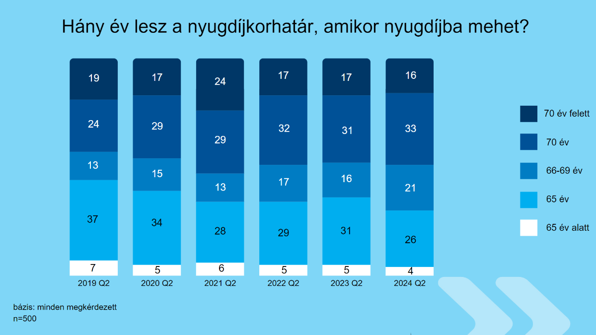 Az idei első negyedévben a válaszadók szerint átlagosan 69 év lesz a nyugdíjkorhatár, mire elérik azt, ami nem jelent változást az elmúlt évekhez képest. Ugyanakkor 33 százalékuk 70 évet említett, ami emelkedést jelent a korábbiakhoz viszonyítva. 5 évvel ezelőtt még csak 24 százalékuk volt ezen a véleményen, azóta pedig fokozatosan nőtt az arányuk. “A kutatás résztvevőinek a nyugdíjkorhatár emelkedését valószínűsítő várakozásait erősíti az is, hogy míg 2020-ig egyértelműen a 65 év volt a leggyakrabban említett kor, addig 2021-2022-2023-ban már fej-fej mellett, közel ugyanannyian említették a 65 és a 70 évet. Ebben az évben pedig már megfordult a trend” - ismertette az eredményeket Székely Pálma, a K&H értékesítés és életbiztosítási üzletágának vezetője.