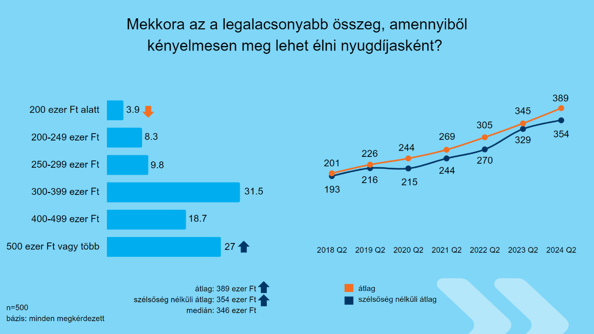 Még érdekesebb a kényelmes megélhetéshez rendelt összeg alakulása. Az idén a középkorúak átlagosan havi 389 ezer forintot tartanak szükségesnek a gondtalan nyugdíjas napokhoz, míg egy évvel korábban, azaz 2023-ban még beérték 345 ezer forinttal. 2018 és 2022 között 201 és 305 ezer forintos átlagos eredményeket hozott a felmérés. A kényelmes életnél a szélsőségek nélküli átlageredmény ebben az évben 354 ezer forintot tett ki, a medián pedig 346 ezer forint volt.