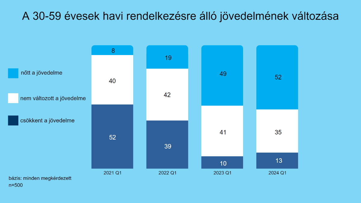 A megkérdezettek mindössze 52 százaléka számolt be arról, hogy az elmúlt egy év során nőttek a bevételei. Ez nagyjából megegyezik a múlt év első negyedévében mért 49 százalékos eredménnyel. Ezzel együtt megállt a korábban látott növekedés: 2021 elején mindössze 8 százalék beszélt jövedelememelkedésről, egy évvel később ugyanez 18 százalékukra volt igaz