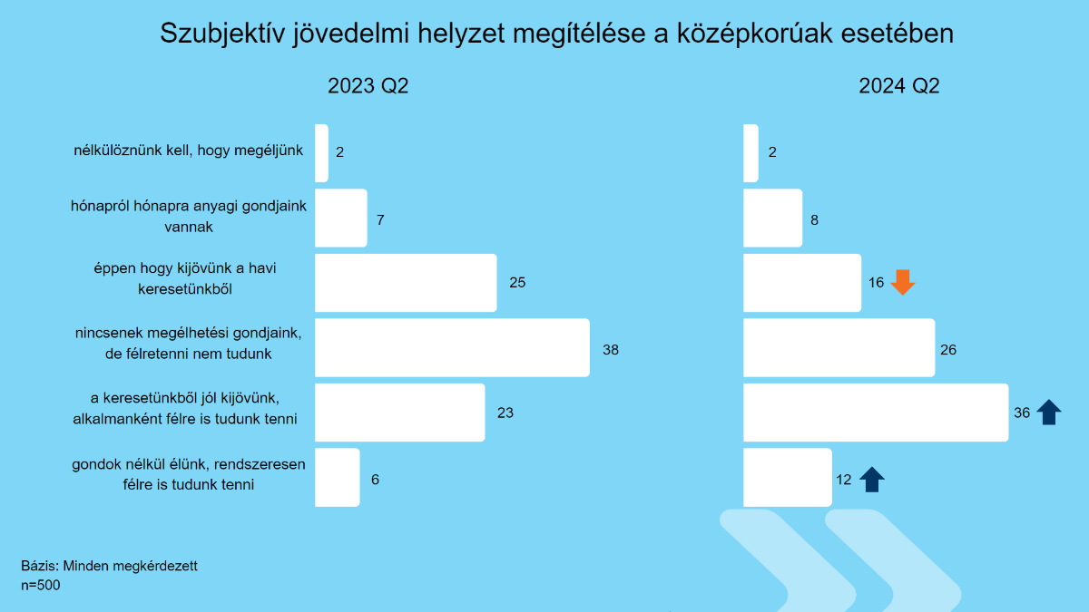 A válaszadók 2 százalékára igaz, hogy nélkülözniük kell, hogy megéljenek. A havonta rendszeresen anyagi problémákkal szembesülők a megkérdezettek 8 százalékát adták, emellett 16 százalékuk azt mondta, hogy éppen beleférnek a havi költségvetésükbe. Ez egyben azt is jelenti, hogy összesen 26 százalékos azoknak az aránya, akik kisebb-nagyobb anyagi problémákkal küzdöttek az idei második negyedévben. Ez javulást jelent az egy évvel korábbi helyzethez képest, amikor 34 százalékos volt az arányuk.