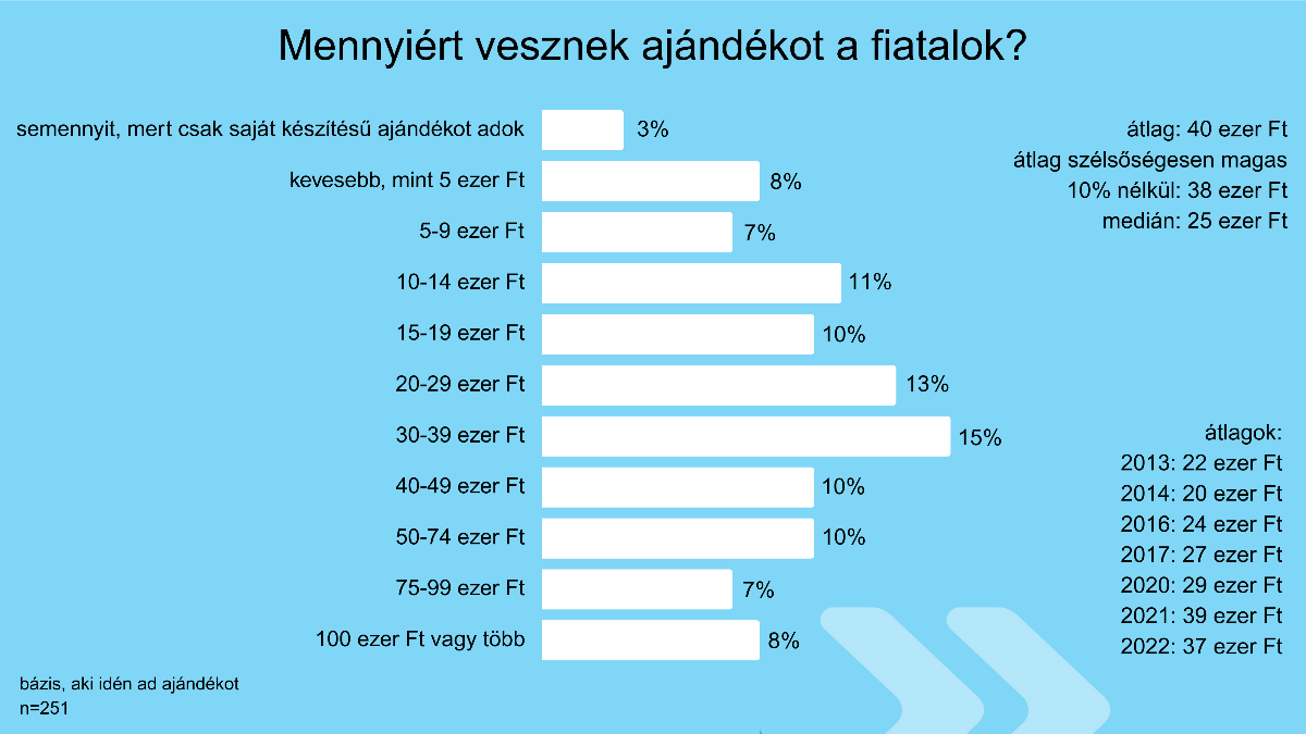 A kutatás szerint az ajándékozásra készülő fiatalok 3 százaléka nem költ ezekre, hanem saját maga készíti a meglepetéseket. Aki vásárol, az átlagosan 40 ezer forintért szerezné be, szemben az egy évvel korábbi 37 ezer forinttal. A szélsőséges válaszok nélküli átlag 38 ezer forint lett az idén, a medián pedig 25 ezer forint. Utóbbi összeg azt jelenti, hogy az ajándékvásárlást fontolgató fiatalok fele ennél alacsonyabb, a másik fele pedig magasabb összeget költene erre.