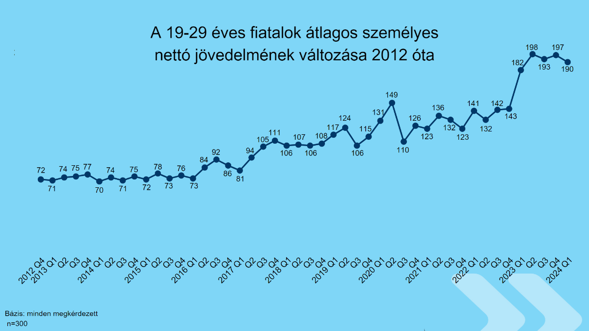 Hosszú sorozat után változott a fiatalok anyagi helyzete, ami a személyes jövedelmüket illeti. A Magyar Marketing Szövetség vállalati tagja, a K&H ifjúsági indexe 2012 óta minden negyedévben bemutatja, hogyan alakul a 19-29 éves korosztály tagjainak személyes jövedelme. A legfrissebb felmérés szerint 2024 első negyedévében 190 ezer forint volt a fiatalok átlagos személyes jövedelme. Ez az összeg az elmúlt négy negyedév értékeihez hasonlóan a legmagasabbak közé tartozik a kutatás történetében, ugyanakkor nagyon hasonló az előző három negyedévben mért értékekhez, azaz a növekedés egyelőre megállt.