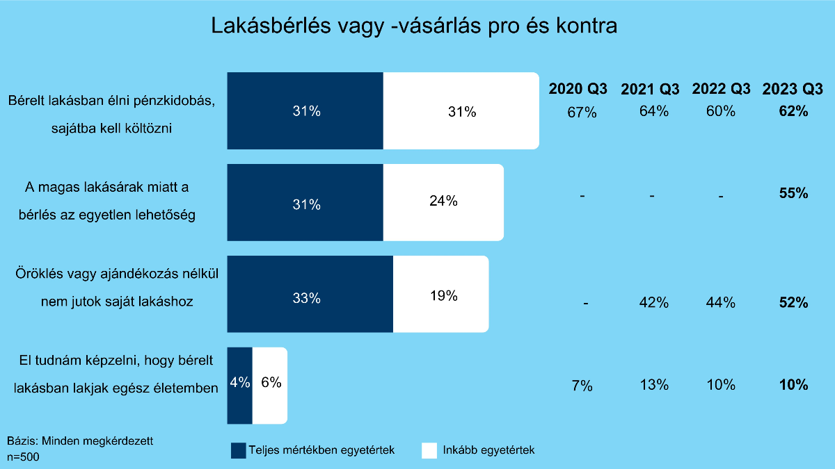 Miközben sokan saját állításuk szerint nem látnak lehetőséget a saját lakás megvásárlására, a megkérdezettek 62 százaléka úgy véli, hogy mielőbb el kell érni ezt a célt, mert a lakásbérlés pénzpocsékolás. A nem saját tulajdonban lévő ingatlanban élőknek pedig 56 százaléka mondta ugyanezt. Az ingatlanvásárlást a középkorúak 54 százaléka sorolta a legjobb befektetési lehetőségek közé, szemben a korábbi felmérésekben szereplő 58-69 százalékkal. A csökkenésben vélhetően szerepet játszik, hogy az ingatlanok drágulása megállt, az idei második negyedévben az elsőhöz képest 0,1, a harmadikban 0,6 százalékkal csökkent a használt lakások ára a KSH adatai szerint.