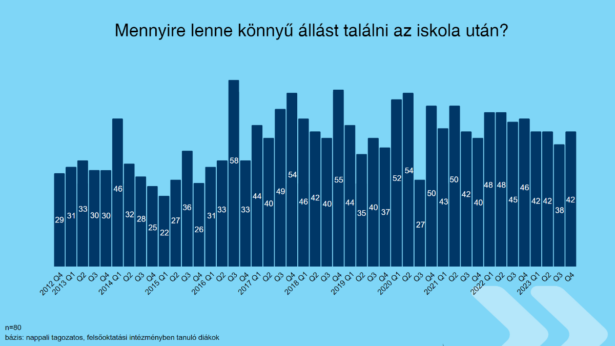 A Magyar Marketing Szövetség vállalati tagja, a K&H ifjúsági indexe szerint a nappali tagozaton tanuló egyetemisták 42 százaléka mondta azt, hogy inkább könnyen vagy nagyon könnyen fog állást találni az iskola után: ez ugyan 4 százalékponttal jobb a július–szeptemberi időszak adatánál, de hosszabb időtávon nézve inkább átlagos értéknek számít. Ezzel együtt voltak negyedévek, amikor az érintettek nagyjából fele, 48-50 százaléka volt ezen a véleményen, de például 2020 és 2022 elején még az 50 százalékot is elérte a bizakodók aránya.
