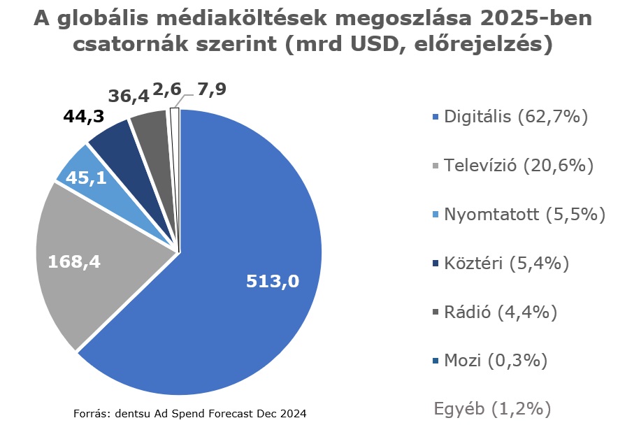A második legnagyobb részaránnyal rendelkező, a reklámköltéseknek továbbra is több mint az ötödét közel negyedét kitevő televíziós hirdetések értéke igen marginális mértékben, 0,6 százalékkal fog bővülni 2025-ben. A csökkenéstől elsősorban a connected TV-költések 18,4 százalék feletti növekedése menti meg ezt a szektort. Eközben köztéri hirdetésekre 3,9, rádióreklámokra 1,1, mozireklámokra pedig 3,2 százalékkal fognak többet költeni a hirdetők.