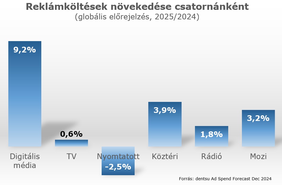 Továbbra is lendületesen fejlődik a világ reklámpiaca: A Dentsu Global Ad Spend Forecasts című elemzés adatai azt mutatják, hogy miközben idén várhatóan 6,8 százalékkal nő a globális reklámköltések összértéke, 2025-ben – annak ellenére is, hogy jövőre kevesebb sporteseményhez és választásokhoz kapcsolódó kampányra kerül sor – további 5,9 százalékkal bővül az reklámiparba áramló pénz mennyisége. Mindez jelentősen meghaladja a világgazdaság növekedési rátáját, ami az IMF előrejelzése szerint jövőre 3,2 százalékos lesz.