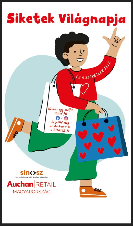 Az idei siketek világnapja alkalmából 19 Auchan áruház állít ki egy installációt, amelyen egy figura látható, aki a „szeretlek” szót jeleli. Arcot pedig bárki adhat neki, aki egy fotó erejéig megáll ezen a hétvégén, hogy így fejezze ki szolidaritását azokkal, akik egyáltalán nem, vagy csak nagyon rosszul hallanak. Ezzel az apró gesztussal és a fotó közösségi médiában történő megosztásával demonstrálhatjuk, hogy értjük egymás nyelvét. Ugyanis sokkal több bennünk a közös, mint ami esetleg elválaszt egymástól, még akkor is, ha másként érzékelünk vagy más eszközrendszerrel kommunikálunk.
