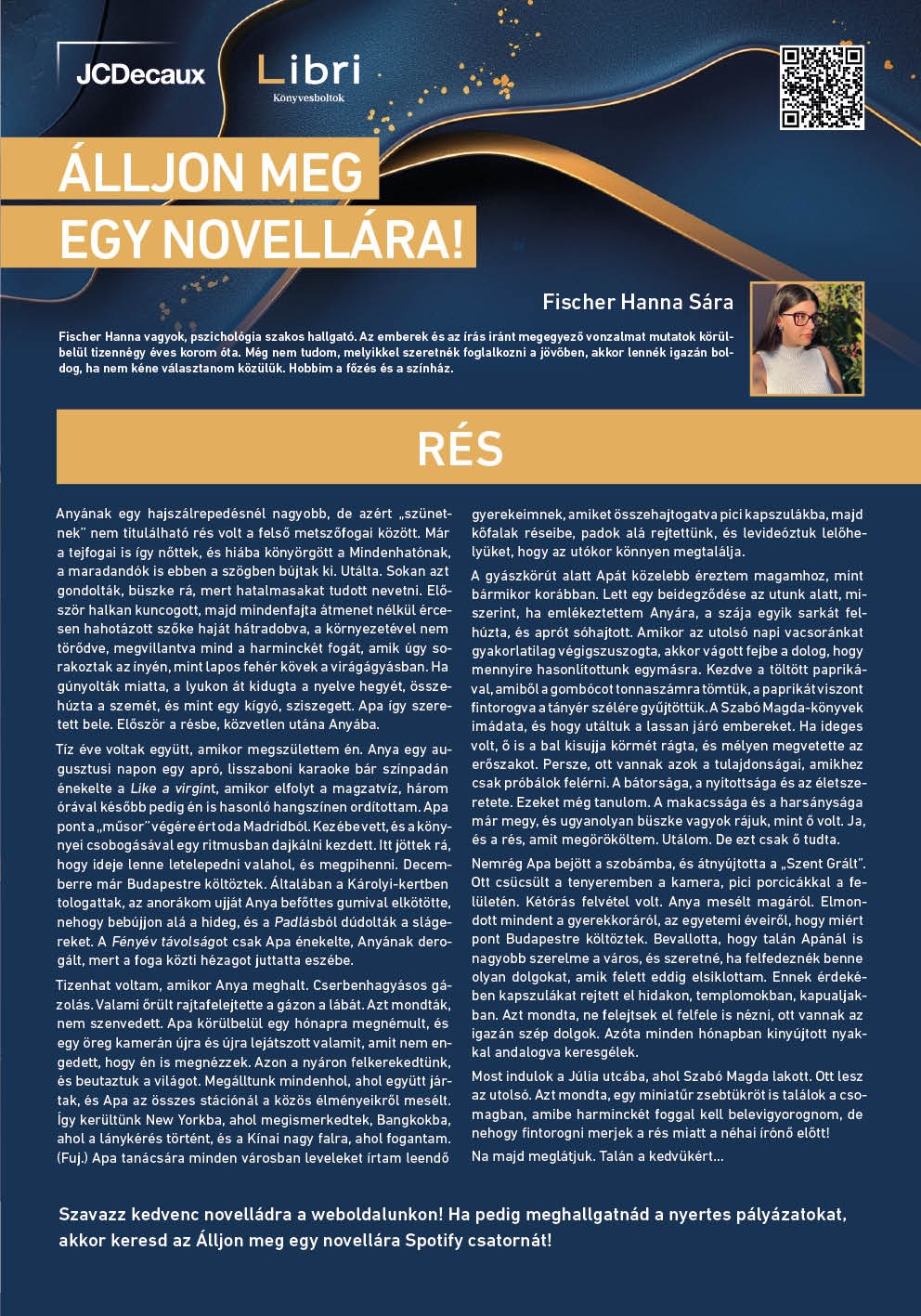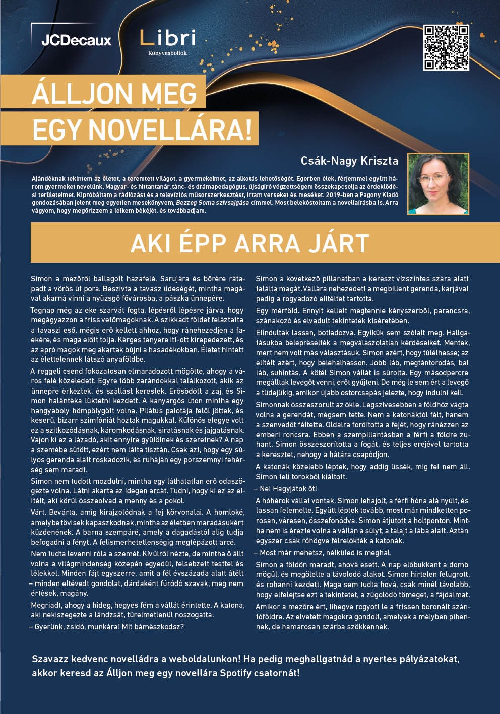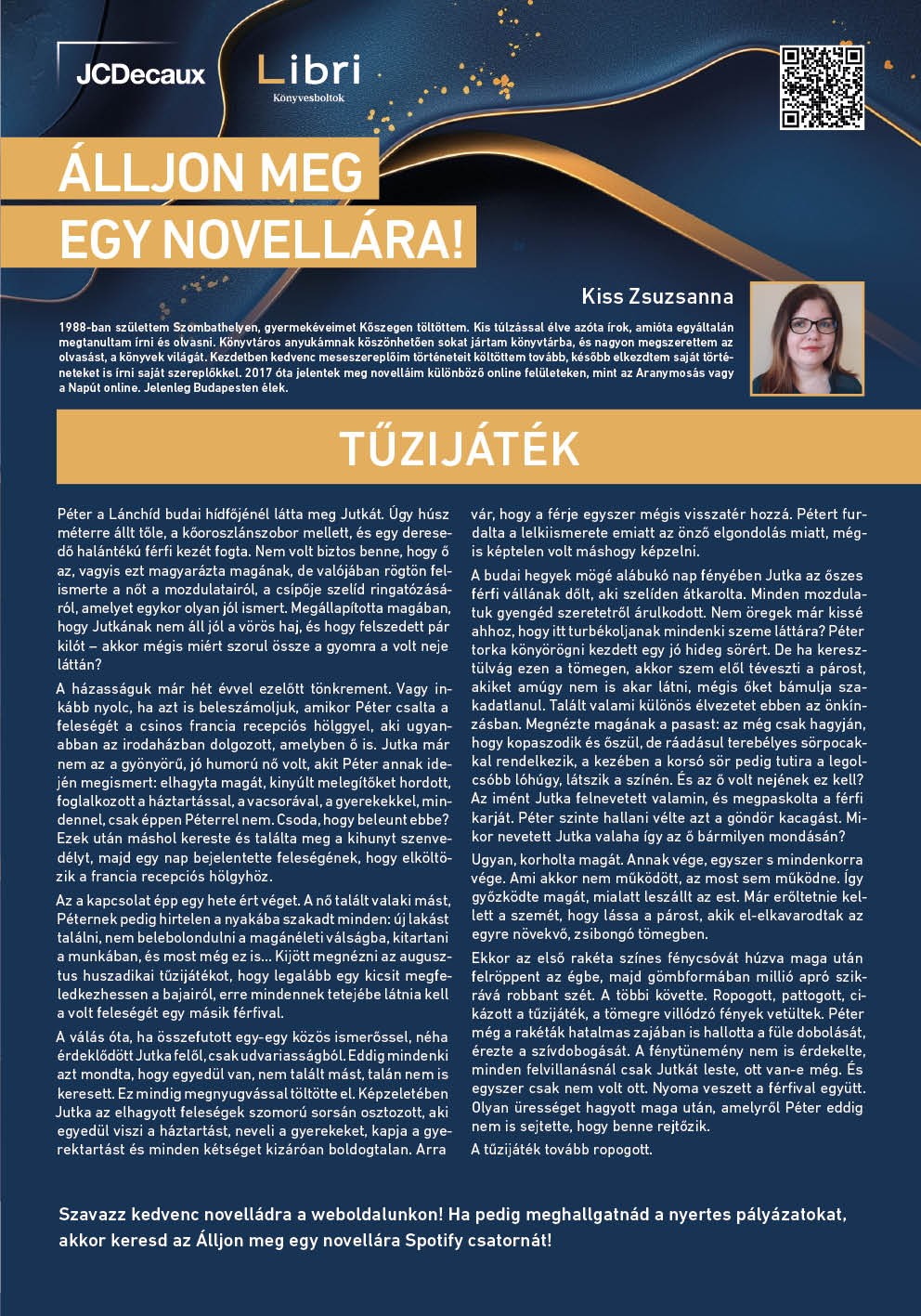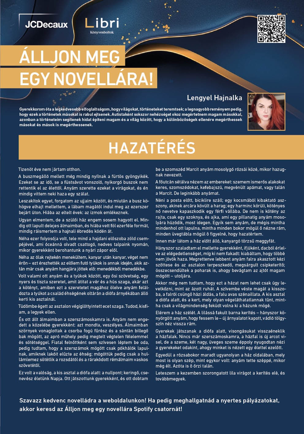 A JCDecaux ikonikus novellapályázata évek óta meghatározza a hazai nagyvárosok látképét: hét év alatt közel 22 500 alkotás érkezett a felhívásra, melyek közül mostanra már 140 jelent meg az ország legforgalmasabb busz- és villamosmegállóiban, beleértve az idei húsz győztest is. A pályázat célja a kezdetektől fogva az volt, hogy tartalmas olvasnivalót kínáljon a tömegközlekedésre várakozóknak, a köztereken népszerűsítse a kortárs irodalmat, és látványos felületet kínáljon akár olyan szerzőknek is, akik eddig még nem publikálták az írásaikat.