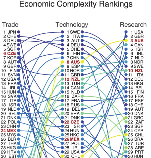 A csoport arra a következtetésre jutott, hogy az export és a technológia együttesen magyarázza a jövőbeli gazdasági növekedést és a jövedelmi egyenlőtlenséget. Azokban az országokban, amelyek mindhárom mérőszámban jól teljesítenek, az üvegházhatású gázok kibocsátása alacsony intenzitású. Ez abból adódik, hogy a három mérőszám korrigálja egymást. Ausztrália például, amely a kereskedelem komplexitásában a 76. helyen áll, a technológia és a légszennyezés tekintetében a 8., illetve a 3. helyre ugrik. Magyarország éppen ellentétes mintát követ: a kereskedelem komplexitását tekintve a 15. helyen áll, de a technológia és tudományos kutatás tekintetében hátrébb sorolódik, a 24., illetve a 30. helyre. Ez részben azt jelzi, hogy a magyar export nem a globális piacra kerül, hanem a szomszédos országok ellátási láncaiba (Magyarország esetében Németországba).
