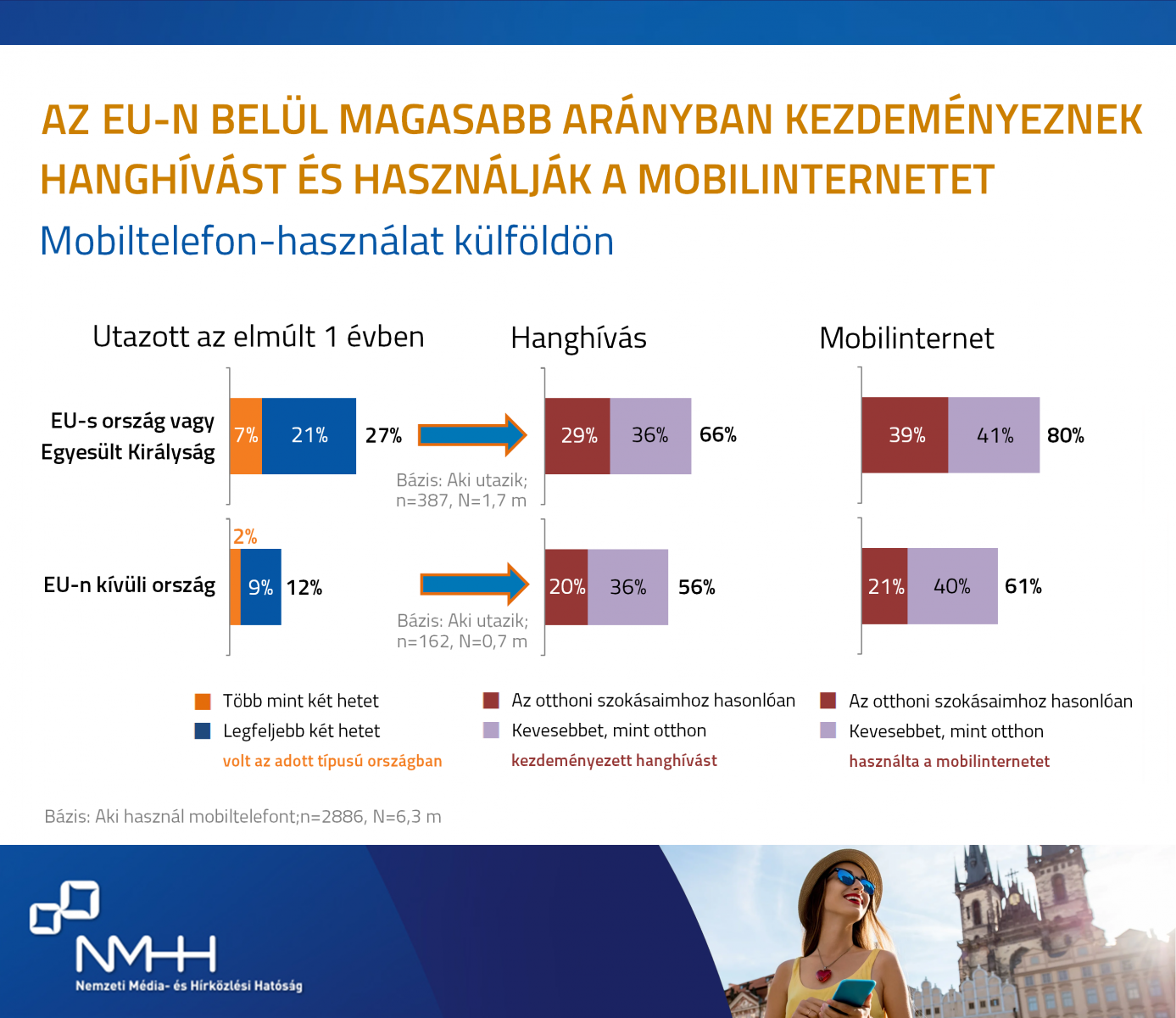 Az NMHH 2023-as internethasználói felmérése szintén megerősítette, hogy az emberek külföldön már többet használják a mobilinternetet, mint a mobil hanghívást. A felmérés szerint a hazai tarifával igénybe vehető, kedvezményes roamingzónákban a magyar utazók 66 százaléka szokott hívásokat kezdeményezni, míg 80 százalékuk használ mobilinternetet.