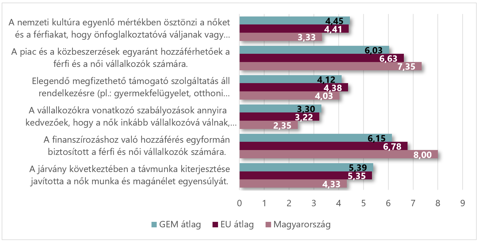 A nemzetközi trendektől jelentősen, negatív irányban eltérő értékelés a nemzeti kultúra nőket vállalkozásra ösztönző jellege kapcsán is érzékelhető. A szakértői értékelés szerint a nők vállalkozóvá válásának korlátai elsősorban a nemzeti kultúrában és az elfogadott társadalmi normákban gyökereznek. A magyarnál gyengébb értékelés e tekintetben a résztvevő uniós országok közül csak Horvátországban és Cipruson született.