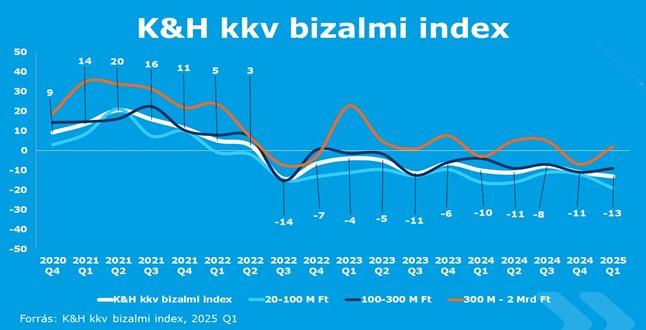 A Magyar Marketing Szövetség vállalati tagja, a K&H magyarországi mikro-, kis és középvállalkozások gazdasági várakozásait vizsgáló bizalmi indexének 2025 első negyedévében -13 pontra süllyedt a múlt év végi -11 pontról. A negatív tartományban tartózkodó mutató arra enged következtetni, hogy a vállalkozások számára lassan megszokottá válik az inflációhoz és az elhúzódó geopolitikai bizonytalanságokhoz való alkalmazkodás. Ezt erősíti az is, hogy a beruházási hajlandóság némileg nőtt, ugyanakkor a bizalmi indexet továbbra is lehúzzák a legkisebb méretű cégek gyengébb várakozásai. A legnagyobb visszaesés a 100 millió forint alatti éves árbevétellel rendelkező cégek körében volt megfigyelhető (-7 ponttal -19-re). A közepes méretű vállalkozások esetében enyhe emelkedés történt (+1 ponttal -9-re), míg a nagyobb vállalkozásoknál jelentősebb javulás következett be (+10 ponttal +2-re).
