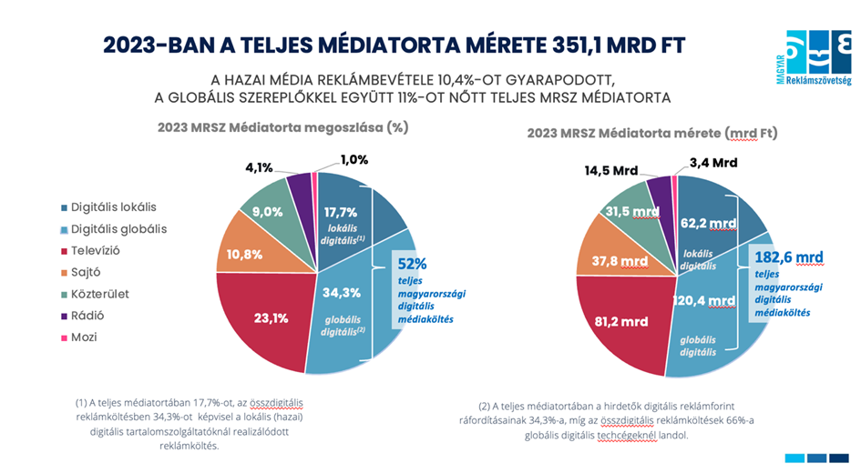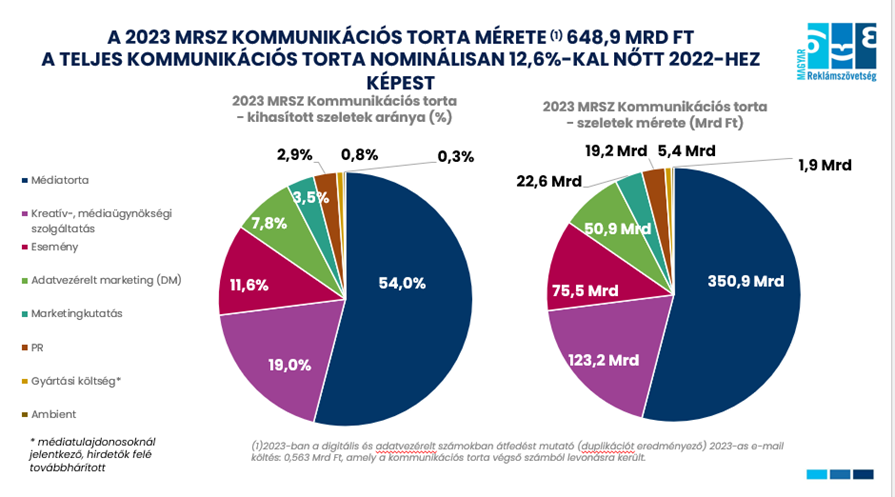 A 2023-as teljes MRSZ Médiatorta 351,1 Mrd Ft. A hazai média reklámbevétele nominálisan kétszámjegyűt, 10,4%-ot gyarapodott, s a globális szereplőkkel együtt 11 %-os növekedést mutat az elősző évhez képest.