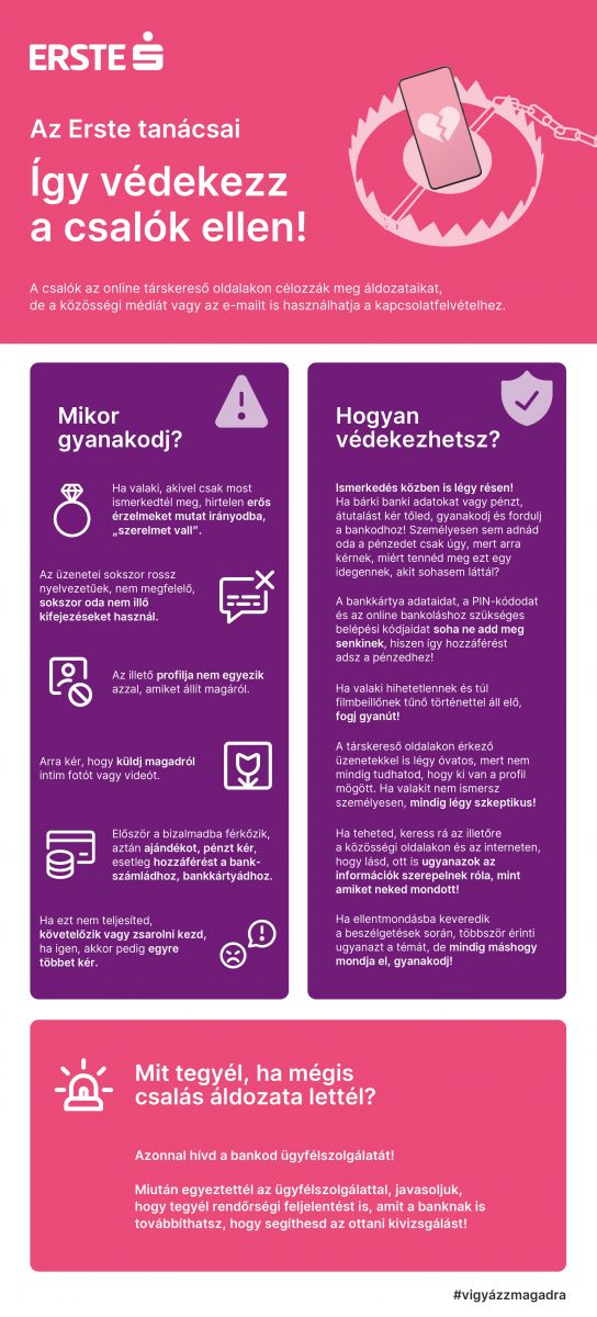 „A szerelmi csalások nem csak hatalmas anyagi, de érzelmi károkat is okozhatnak, amivel foglalkozni kell. Az áldozatok ráadásul a legtöbb esetben szégyellik, ami velük történt, így segítséget sem mernek kérni. Pedig fontos, hogy ezekről az esetekről a bankok és a hatóságok is tudomást szerezzenek, hiszen így akár meg is lehet akadályozni egy-egy esetet, esetleg csökkenteni a kár összegét. A Valentin-nap közeledtével még inkább megszaporodhatnak az ilyen csalások, az Erste ezért most honlapján és közösségi oldalain hívja fel a figyelmet ezekre a visszaélésekre. Azt is összeszedtük, mit tehetnek az ügyfelek, hogy pénzük továbbra is biztonságban legyen” – mondta el Kósa Anna, az Erste compliance vezetője. Szerinte a környezet, a rokonok a barátok sokat tehetnek azért, hogy megóvják az áldozatokat: ahogyan óriási érzelmi megterhelést jelent egy szakítás, vagy akár egy rosszul sikerült randi is, úgy még nagyobb traumát jelenthet egy csalás áldozatává válni. Ez óriási fájdalommal járhat, fontos, hogy ne bagatellizáljuk el az áldozatok érzéseit és empátiával forduljunk feléjük.